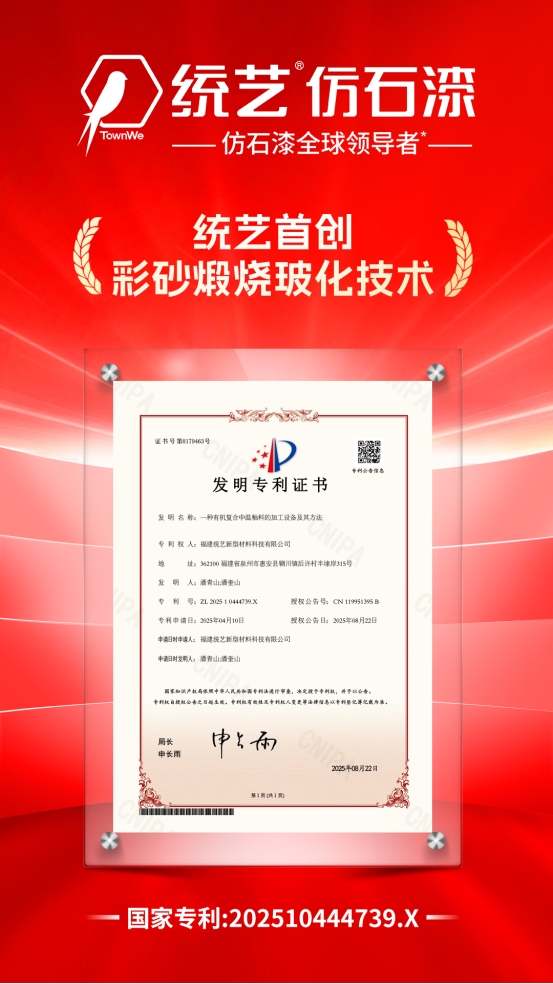 一项技术的突破,可以重塑一个行业;一项专利的取得,可以标定一个时代。近日,国家知识产权局正式向统艺授予「彩砂煅烧玻化技术」 国家发明专利(专利号: 202510444739.X )。 这不仅是对统艺技术实力的权威认可,更是全球仿石漆领域的里程碑事件,标志着中国自主原创技术在世界建筑饰面赛道上取得了具有「开创性、基础性、引领性」的重大突破。