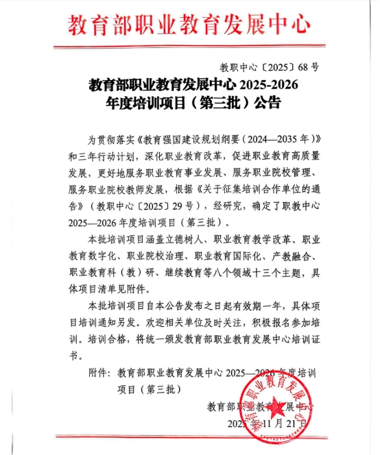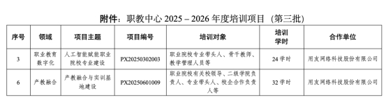 近日,教育部职业教育发展中心公布《教育部职业教育发展中心2025-2026年度培训项目(第三批)》。由用友网络承办的人工智能赋能职业院校专业建设 和产教融合与实训基地建设 两个项目成功入选。