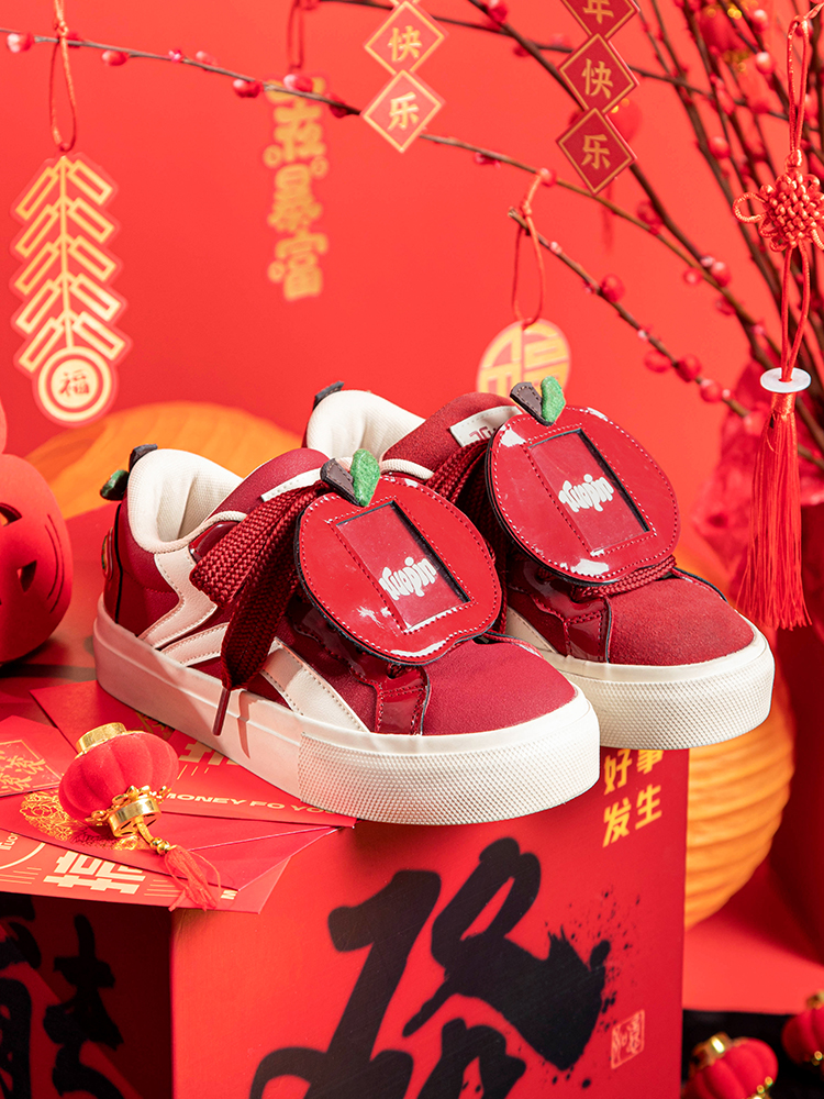 鮀品品牌设计生产的原创设计有钱花板鞋和原创设计苹果痛鞋,在红色系鞋款中自带祝福寓意,深受消费者的喜爱与好评。原创设计“有钱花”板鞋鞋面上的可拆卸鞋扣和鞋底的祝福语印花都紧扣“有钱花”的概念,为消费者送上美好祝福;另外该款板鞋还特别推出了秋冬加绒款,温暖柔软的鞋面同色短羊羔绒触感舒适,也为消费者在秋冬寒冷天气下的穿着提供了温暖保障。