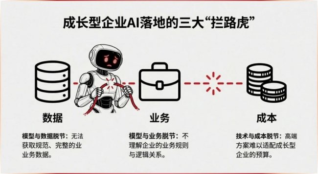 说到底,成长型企业搞AI难,就难在三个“脱节”:模型与数据脱节、模型与业务脱节、技术与成本脱节 。