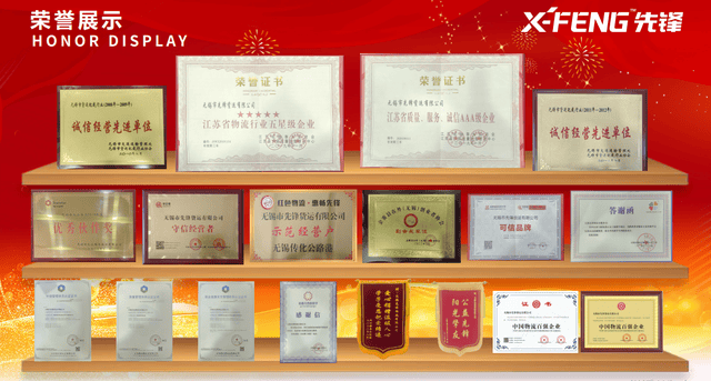在管理体系上, 先锋物流严格遵循ISO9001 质量管理体系、ISO14001 环境管理体系、OHSAS18001 职业健康安全管理体系标准规范运作,先后获评江苏省物流行业五星级企业、江苏省质量服务诚信 AAA 级企业、无锡市货运配载行业诚信经营先进单位(2008-2009 年、2011-2012 年)、红色物流・惠畅先锋示范经营户、守信经营者、可信品牌等多项荣誉,更成功跻身中国物流百强企业之列,2019 年获评江苏省质量服务诚信 AAA 级企业,2023 年正式获评 ISO9001 质量认证企业,行业口碑与品牌影响力持续提升。