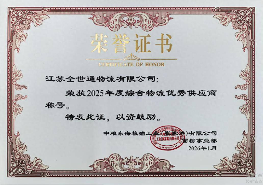 在长期的产业服务实践中,公司始终坚持提质升级、创新发展,2025 年度更是展现出卓越的运营能力、稳定的履约水平与高效的协同响应机制,数字化服务能力持续优化,在运输时效性、仓储管理精度、供应链韧性建设、绿色低碳实践及客户满意度等关键维度均表现突出,综合实力位居行业前列,还被中粮东海粮油工业(张家港)有限公司评为 “2025 年度综合物流优秀供应商”,其专业化、标准化、智能化的物流服务体系得到行业高度肯定。