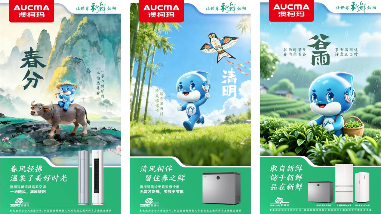 为实现IP形象的全方位渗透,澳柯玛构建了线上线下联动的传播与应用体系,将“AI·小澳”深度融入企业形象宣传的每一个环节:线上端,该形象广泛应用于官方网站视觉体系、电商平台宣传物料,同步渗透到微信、微博、小红书等新媒体平台的各类宣传素材中,结合二十四节气推出系列主题海报,让IP形象伴随用户日常;同时,精心打造系列微信表情包,以趣味化、轻量化的形式助力社交传播,让品牌形象在轻松互动中深入人心。