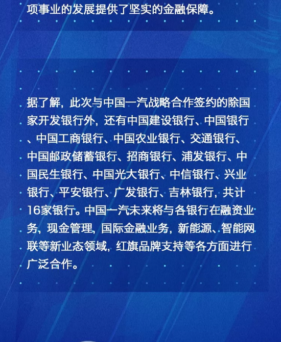 据了解,此次与中国一汽战略合作签约的除国家开发银行外,还有中国建设银行、中国银行、中国工商银行、中国农业银行、交通银行、中国邮政储蓄银行、招商银行、浦发银行、中国民生银行、中国光大银行、中信银行、兴业银行、平安银行、广发银行、吉林银行,共计16家银行。