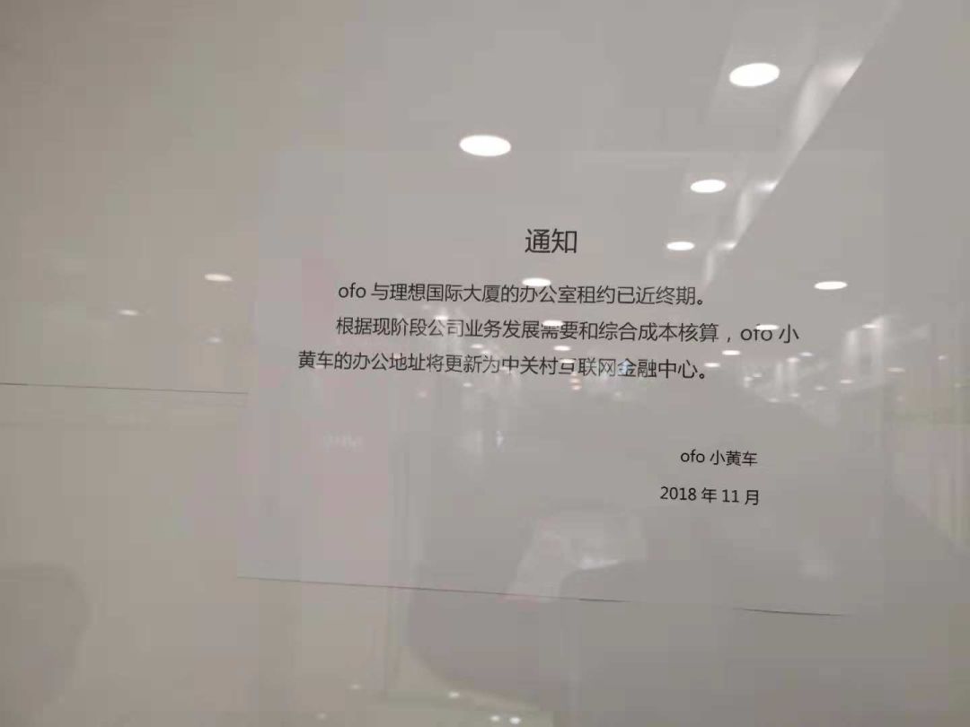 小黄车缘何从总部搬离?在15层的玻璃门上,对于搬离总部,小黄车给出了答案:“ofo与理想国际大厦的办公室租约已近终期。根据现阶段公司业务发展需要和综合成本核算,ofo小黄车的办公地址将更新为中关村互联网金融中心。”