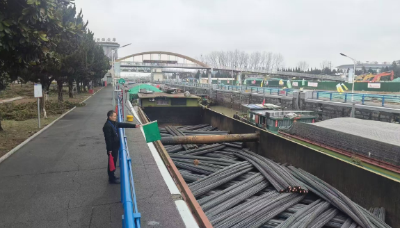 图为:船闸工作人员正在指挥装运钢材的船舶安全过闸