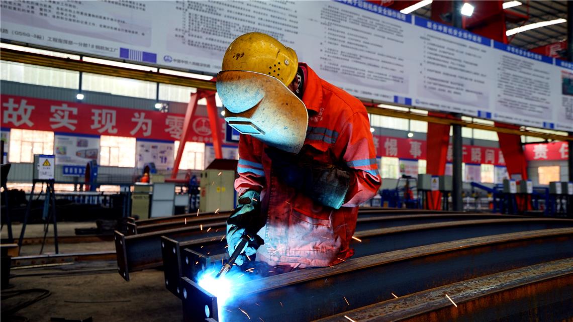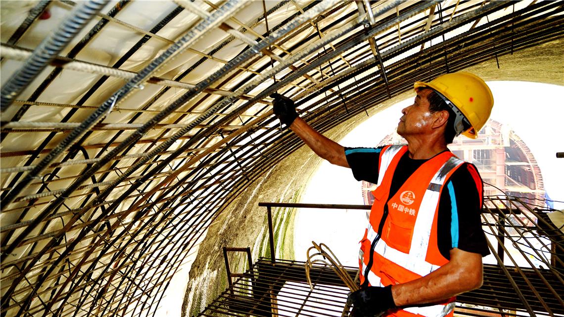 图为施工人员在绑扎钢筋。