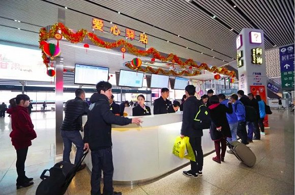 广州南站于2014年创建“爱心驿站”品牌,爱心接力让各类服务无缝对接。2018年,深化服务品牌开展“广铁U彩”服务,站内设置7个“广铁U彩”服务台,进一步缩短旅客咨询距离。